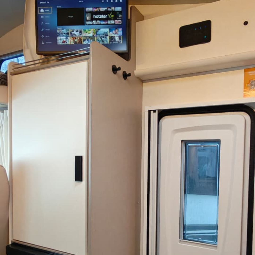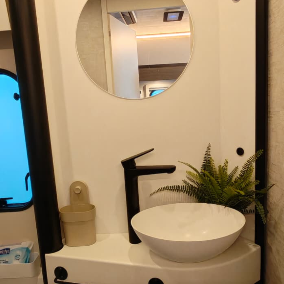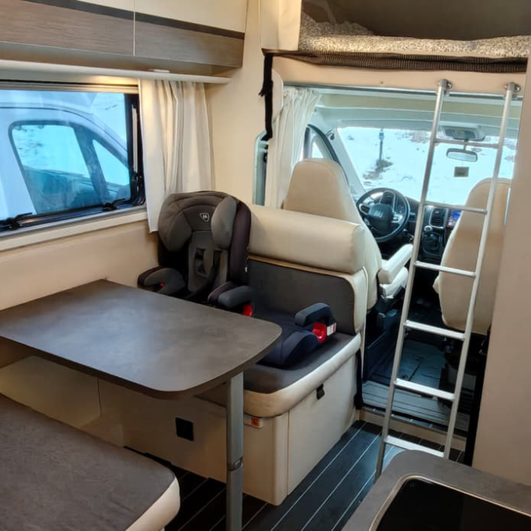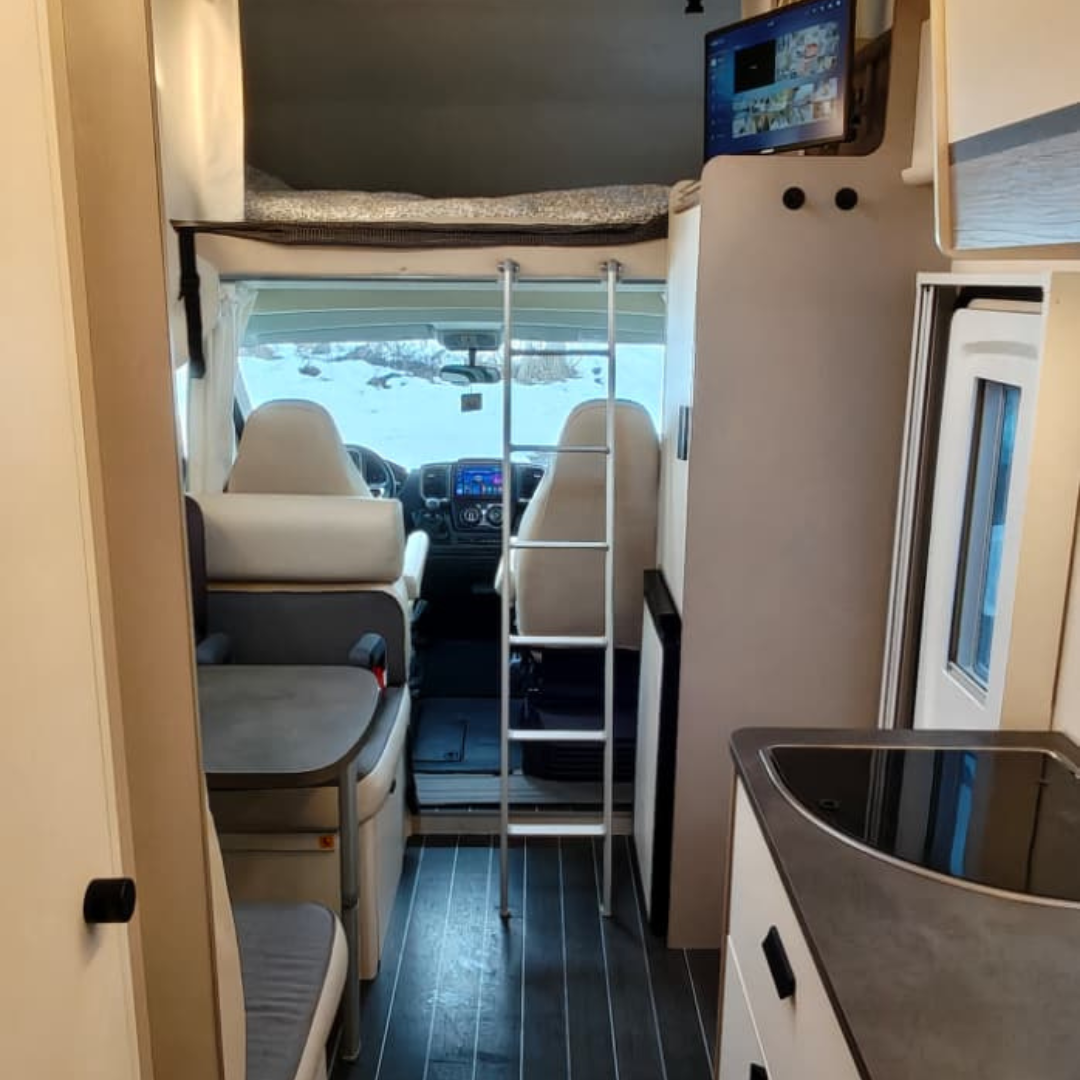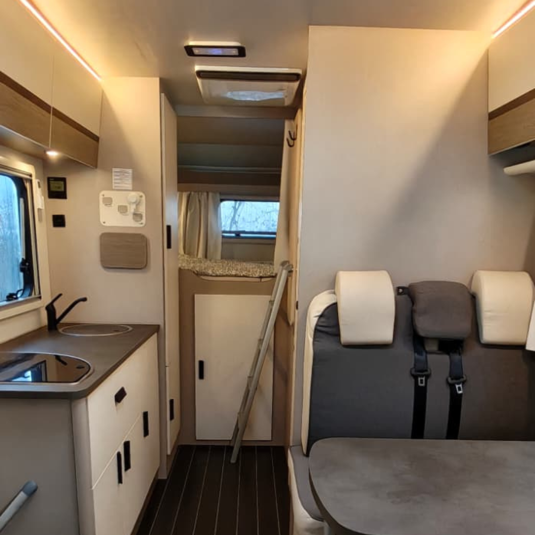 Interiorul este modern și luminos, cu spații multiple de depozitare, mobilier funcțional și iluminare LED. Sistemul Truma Combi asigură încălzire eficientă și apă caldă în orice sezon. Pentru un plus de autonomie, autorulota este echipată cu panou solar, baterie auxiliară și invertor.