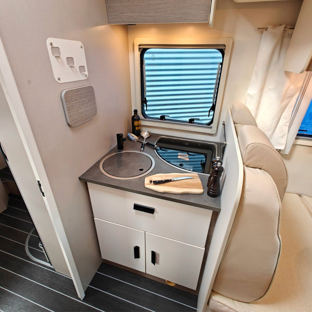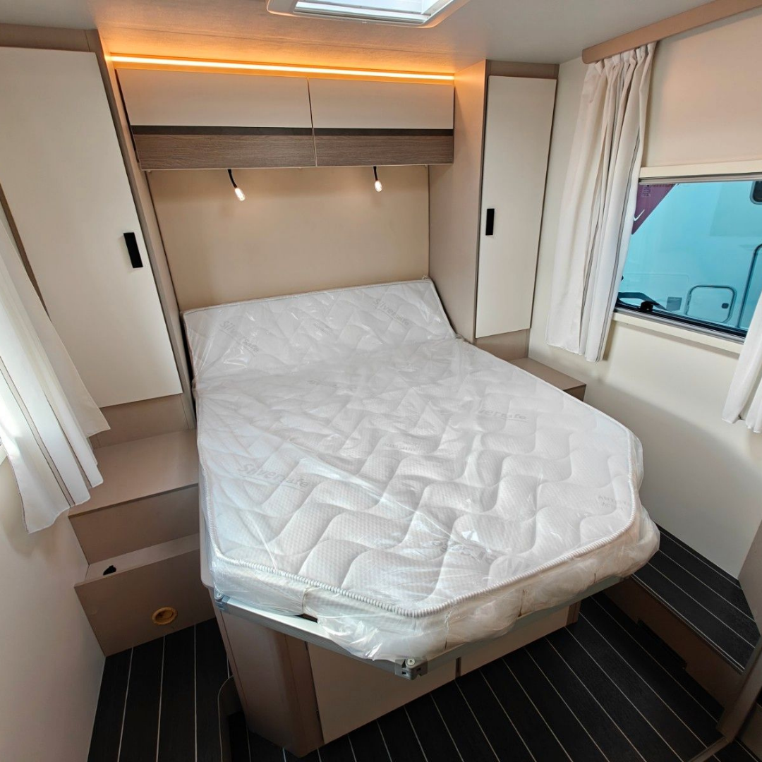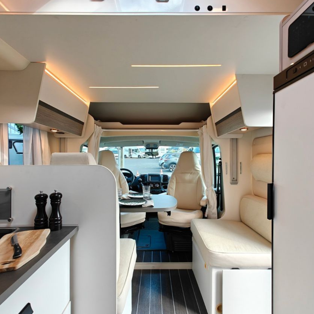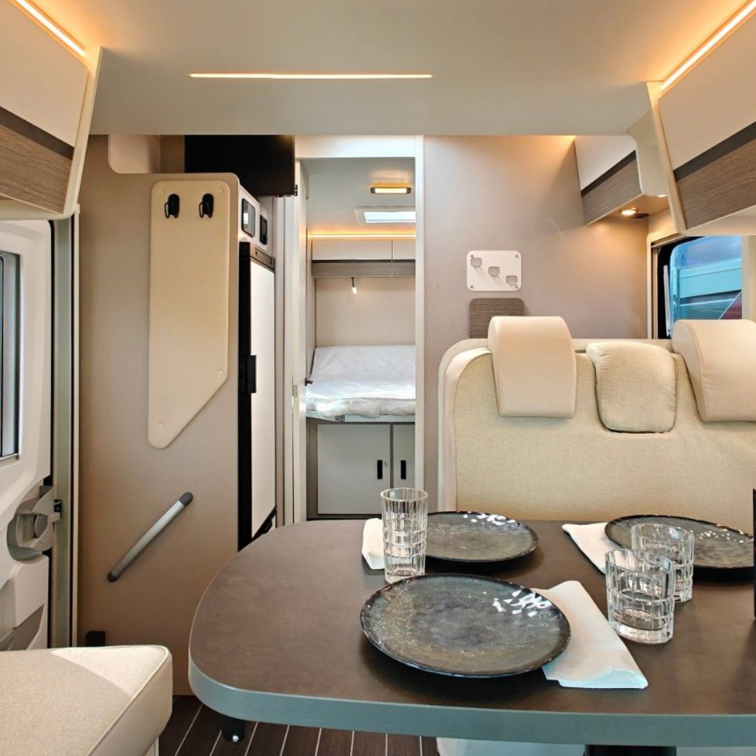 Interiorul modern dispune de numeroase spații de depozitare, mobilier funcțional și iluminare LED ambientală. Sistemul Truma Combi asigură încălzirea eficientă a spațiului și apă caldă indiferent de sezon. Pentru autonomie sporită, autorulota este echipată cu panou solar, baterie auxiliară și invertor.